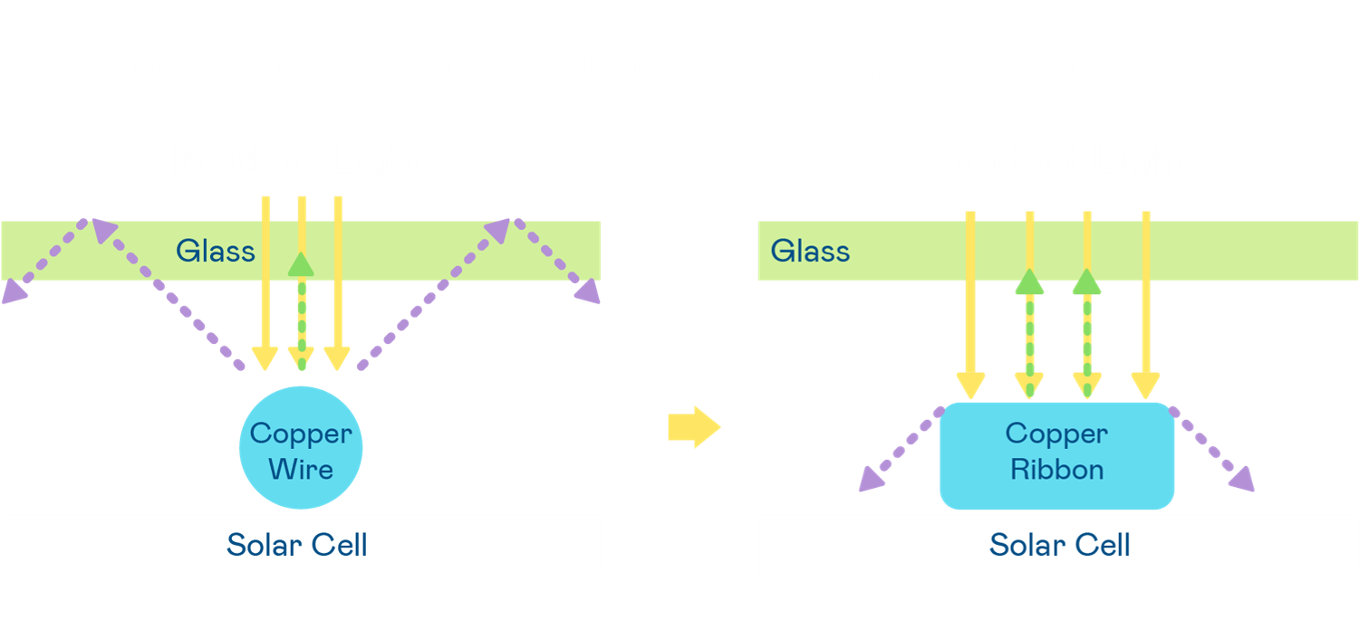 • 电池使用多条铜导线 (Copper wire) 于电池片上形成较短的电流路径,提高电流收集效率,采用圆形设计的铜导线较传统扁平式的铜焊带 (Ribbon),可增加入射至电池的光线量。